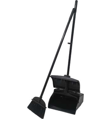 Lobby Dust Pan Set featuring a covered dust pan and long-handle broom, designed for efficient and hygienic floor cleaning. The self-locking system allows it to stand upright, also dual casters ensure smooth movement. Ideal for quick debris collection . Available in Black and Grey. Primary packing: 6 pcs per box.